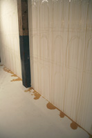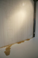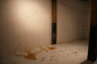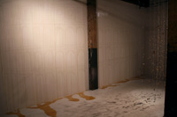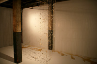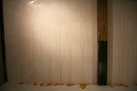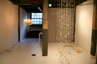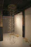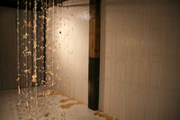 | Indicator was a three person installation exhibition presented for Toronto Nuit Blanche 2013. Indicator species such as Birds, bats and bees signal the deteriorated state of ecosystems, warning us when our environs are in trouble. These three installations investigate the concept of biological indicators and the suffering of wildlife due to habitat destruction, climate change, and environmental contamination. Jessica Marion Barr's "Augury : Elegy" formed a rain cloud of bird bones. Karen Abel's "Hibernaculum" was a chandelier inhabited by crystalline cast-sugar bats. Encircling the space was Gareth Bate's ghostly "Colony Collapse" an amphitheatre-like wall mural of the ancient Roman Coliseum and aquiducts hand drawn with liquid honey. The honey gradually slid down the walls leaving a ghostly image and pools on the floor. Read more | ||||||