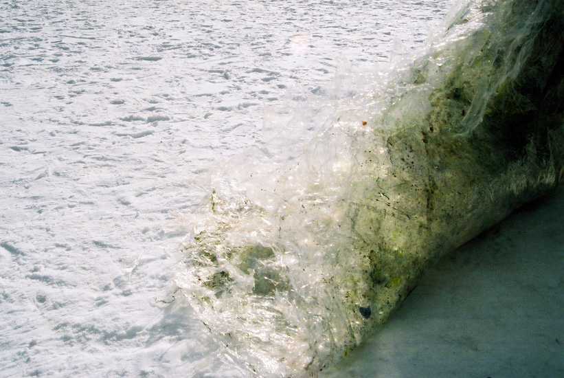 | Detail: Plastic Painting: Snow Installations: Grange Park, Toronto, acrylic paint in plastic cling wrap over, 2007. Return to Installation Menu | Return to Snow & Ice Installation Menu | Artist Statement |