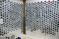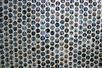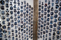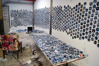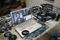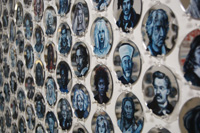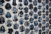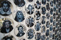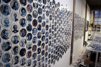 The images below are from Gareth Bate's studio. They show the current development of his Jewel Net of Indra installation which will take several years to complete. Gareth has now painted 1600 people, the original installation was 325. His ultimate goal is 6765. The finished version won't be exhibited for several years. Because the mirrors are now on opposite walls you can see the infinite reflection aspect that didn't happen in the original installation. See the first installation | Read Artist Statement and List of Names |