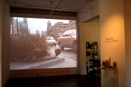 Le français ci-dessous... Galerie Glendon Gallery New Season at York University's Glendon Gallery opens October 7th with Penance & Devotion featuring a video projection and large landscape paintings by emerging Toronto artist Gareth Bate. Opening Reception: October 7th, 6 to 8 pm. Solo Exhibition In Nov. 2007 Gareth Bate crawled along Toronto's Queen Street West from Soho Street to Spadina Avenue with a field of grass on his back. It was painful and tiring. This bizarre act of self-punishment and humiliation for the guilt of environmental destruction has been captured in the performance video Penance. The exhibition also features Bate's large-scale paintings. His "Lament" series deals with a sense of personal sorrow, loss and hope in relation to the destruction of the natural world. Dates: October 7 - November 1, 2008 Location: Glendon Gallery, Glendon College, York University, 2275 Bayview Ave. Toronto, Ontario, M4N 3M6. Tél.: 416-487-6721. Directions: Yonge Subway to Lawrence, 124 Sunnybrook Bus short ride to Glendon Campus. Gallery Hours: Tuesday to Friday: noon - 3:00 pm - Saturday: 1:00 pm - 4:00 pm Biography: Gareth Bate graduated from the Ontario College of Art and Design in 2007. He is the winner of the 401 Richmond Career-Launcher Prize, a 500 square foot studio given to one OCAD BFA graduate for one year. He has won several awards for painting and art writing, and received an Ontario Arts Council Grant. He has shown at a number of Toronto galleries including Loop, Bau-Xi, Gallery 44, Arcadia, Toronto Outdoor Art Exhibition, Gladstone Hotel and exhibited in Nuit Blanche. His work has been featured in Now, Xtra, Lytearts.com , Liberty & Annex Gleaner, OCAD's Canvas, Snap Toronto and coming soon in Checkerspot Magazine and Things of Desire. Website: http://www.garethbate.com Acknowledgments: The artist would like to thank guest curator Colette Laliberté for all guidance and support. Glendon Gallery would like to thank its media partners: L'Express & Le Métropolitain newspapers, Radio-Canada TV & radio CJBC 860 AM, Première Chaîne and Clic Toronto. Special thanks go out to the Advising Committee: Marc Audette, Nadine Bariteau, Omid Fekri, Anna Husdon and Colette Laliberté. MEDIA CONTACT: Martine Rheault, Coordinator of Artistic and Cultural Affairs, 416-487-6859. artculture@glendon.yorku.ca - 30 -