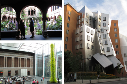 Boston and Cambridge, Massachusetts.The next stop was Boston. I stayed in Cambridge. The Isabella Stewart Gardner Museum was a real treat. This mansion turned art museum is preserved in its exact original curatoral condition. The Boston Museum of Fine Art is fantastic and filled with famous work. I particularly liked the modern and Mayan sections. I also enjoyed the Institute of Contemporary Art. A highlight of the trip was the Mapparium at the Mary Baker Eddy Library, a room in the form of giant lit up globe. I saw the Frank Gehry designed Stata Centre at MIT. Photo: The Issabella Stewart Gardener Museum, The Boston Museum of Fine Art and Frank Gehry's Stata Centre at MIT, Gareth Bate |