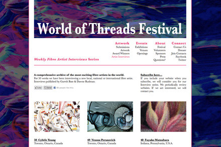 Weekly Fibre Artist Interviews SeriesEvery week for the last year, along with Dawne Rudman, I've published a new "Weekly Fibre Artist Interview". For 83 weeks we have been profiling local, national and international fibre artists. It has created a comprehensive archive of some of the most exciting fibre artists in the world. We have subscribers in 52 countries. |