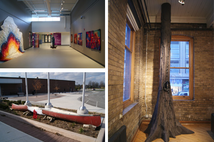 Smaller World of Threads ShowsI curated 5 smaller shows for the 2012 Festival. Four were co-curated with Dawne Rudman. Protrusion at Toronto's 401 Richmond St. W. featured four artists whose installations all protruded from the wall or from one floor to another. In Oakville the show Myth Making at The Display Area at Queen Elizabeth Park Community and Cultural Centre (QEPCCC) featured 3 artists dealing with mythology. Variegated Threads at QEPCCC was a variety of wall and installation work in the halls. The Outdoor Environmental Installations on the grounds of QEPCCC featured artists taking fibre outside. Fibre Collage at Abbozzo Gallery was a small show of collage work using fibre materials. Photo: Myth Making, Outdoor Environemental Installations and Protrusion. |