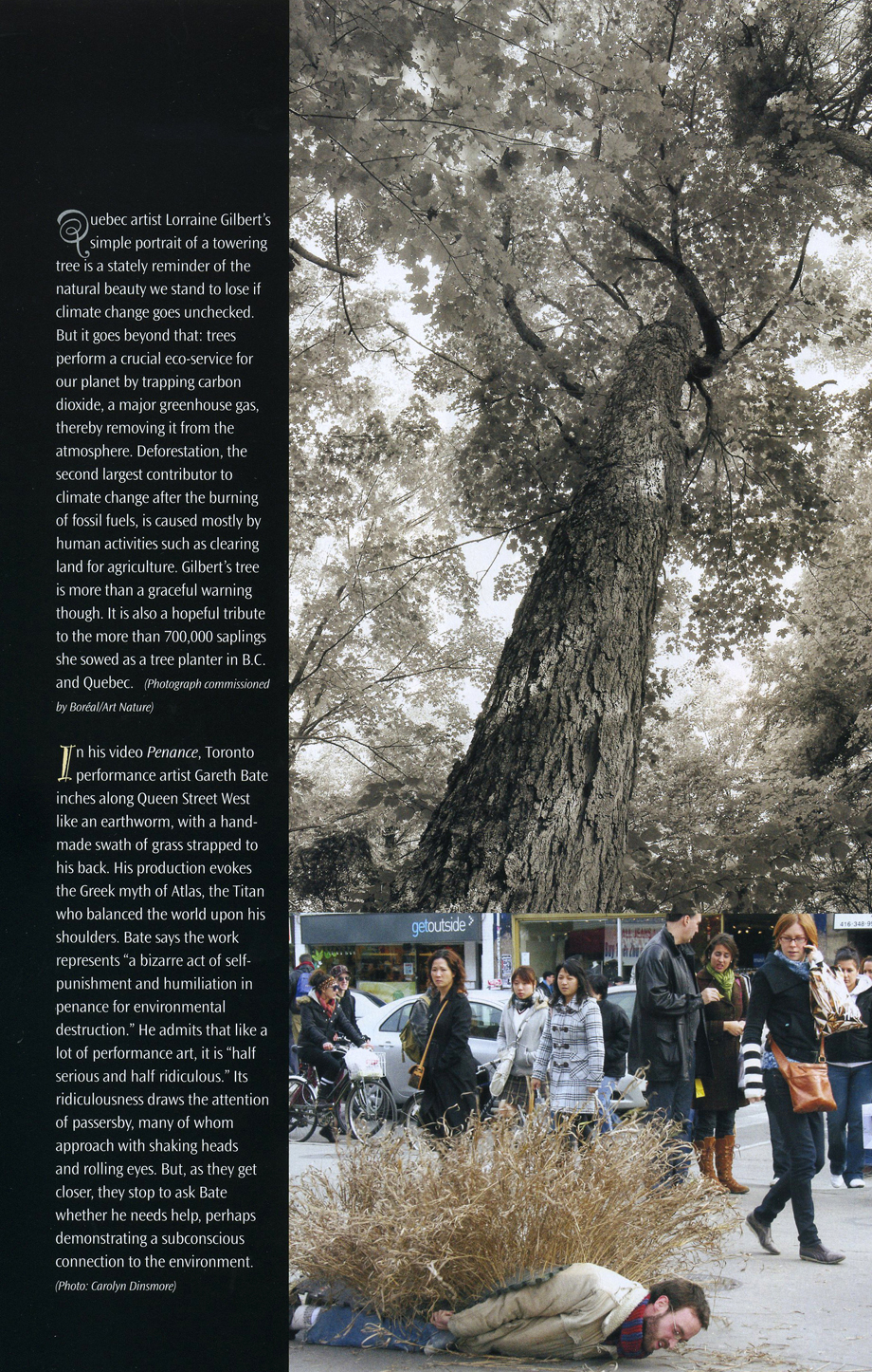 In his video Penance, Toronto performance artist Gareth Bate inches along Queen Street West like an earthworm, with a hand-made swath of grass strapped to his back. His production evokes the Greek myth of Atlas, the titan who balanced the world upon his shoulders. Bate says the work respresents "a bizarre act of self-punishment and humiliation in penance for environmental destruction." He admits that like a lot of performance art, it is "half serious and half ridiculous." Its ridiculousness draws the attention of passersby, many of whom approach with shaking heads and rollings eyes. But, as they get closer, they stop to ask Bate whether he needs help, perhaps demonstrating a subconscioius connection to the environment.