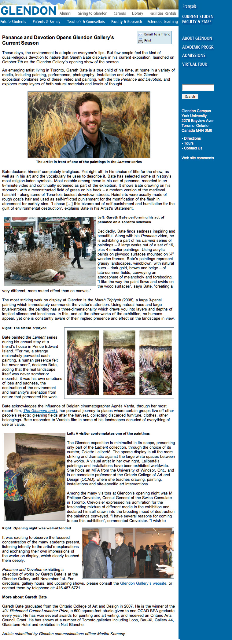Penance and Devotion exhibiting a selection of works by Gareth Bate is at the Glendon Gallery until November 1st. For directions, gallery hours, and upcoming shows, please consult the Glendon Gallery's website, or contact them by telephone at: 416-487-6721.
