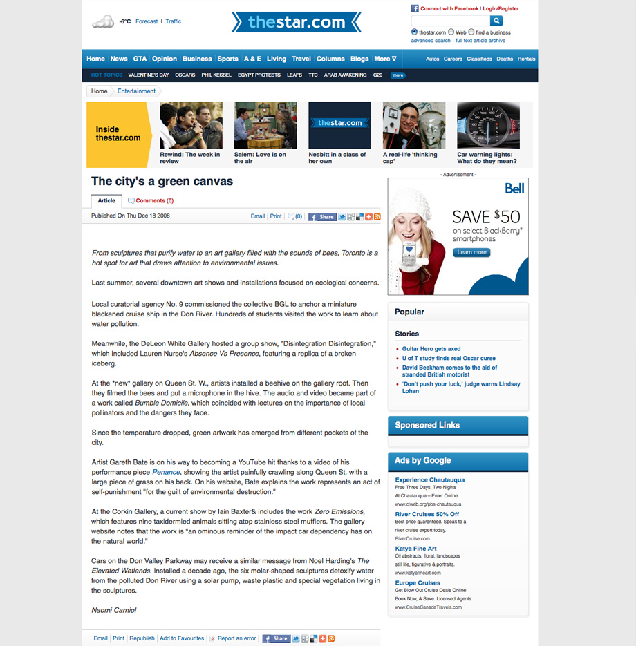 At the *new* gallery on Queen St. W., artists installed a beehive on the gallery roof. Then they filmed the bees and put a microphone in the hive. The audio and video became part of a work called Bumble Domicile, which coincided with lectures on the importance of local pollinators and the dangers they face.