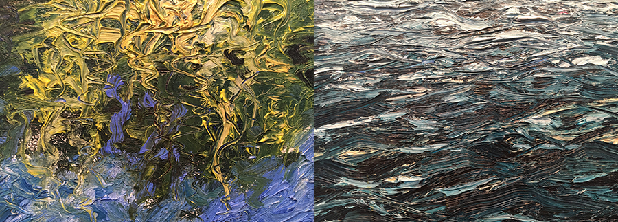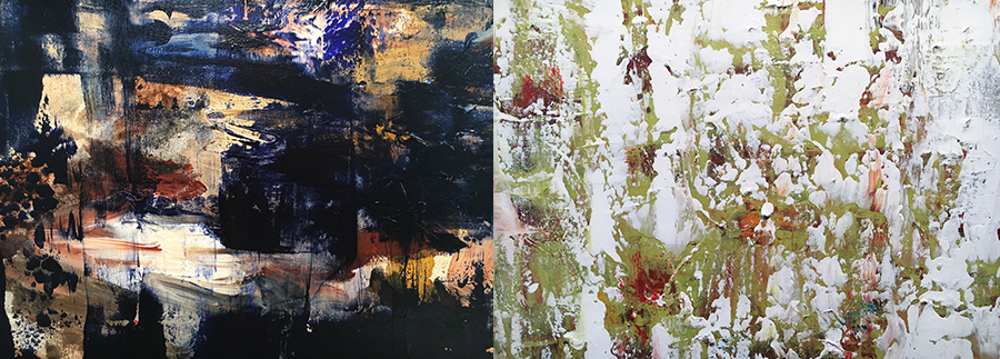 The top paintings are wet on wet in oil paint. The bottom four are acrylic constructed using layers of wet paint over dry. Paintings by Gareth Bate. .