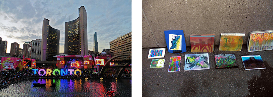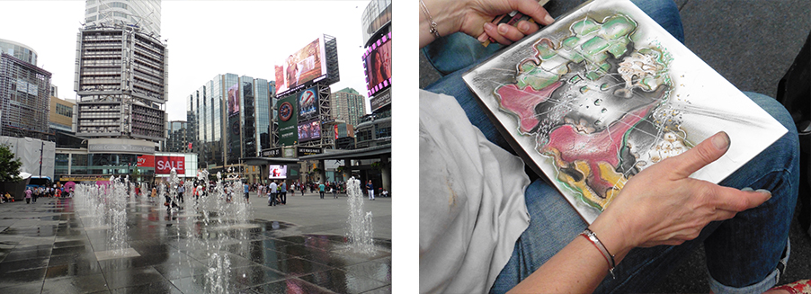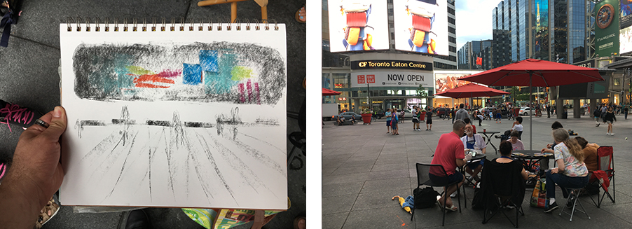 Yonge and Dundas Square. Drawings by Simone Diselets, Christine Dart, Arlene Lerer, Gary Christie. Photo: Gareth Bate. Water photo: Gary Christie.