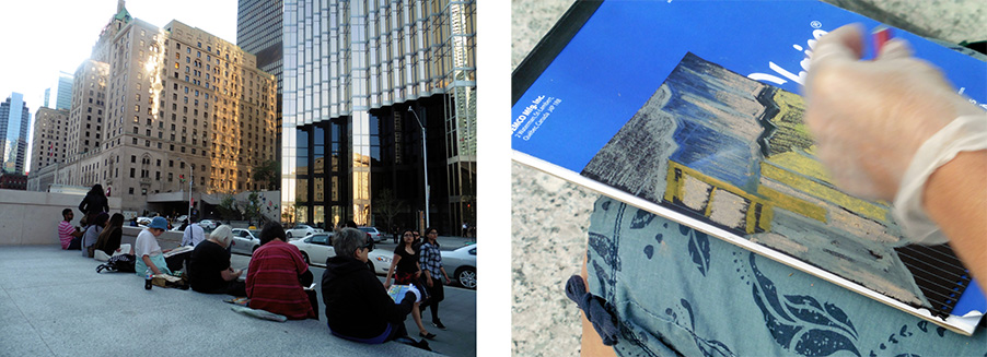 ON LOCATION: I’ve selected places that're visually exciting with access to bathrooms and shade and the potential to relocate to somewhere covered or indoors if necessary. For each drawing assignment I give you a theme or approach designed to make you notice unexpected things. You’ll go off to explore the location for about 20 minutes. You'll draw inspiration from the energy, imagery and sounds of the place. We then all get back together and begin a drawing. We'll do two drawings in each class.