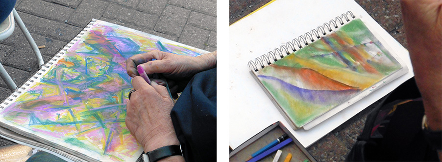 I'm a bit embarrassed to be drawing outside. What if people come look and comment? A few people will come by and look at what we're up to. They're just curious. People love seeing artists on the street. I've found that since we're drawing abstractly people have no idea what to make of the drawings! So they tend not to comment or linger. It's quite funny. There is no need to be shy about your drawings.