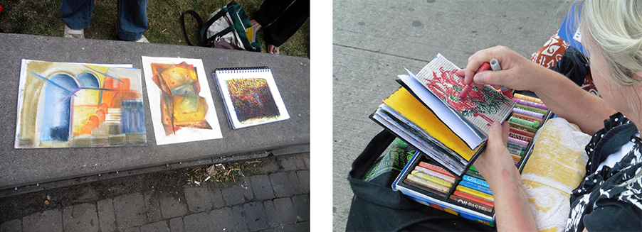Can I work in a medium other than pastels and chalk? If you really want to yes. Chalk and oil pastel are really versatile and easy to carry. Some people have worked in professional artist markers which are awesome but expensive. You could also work in watercolour or ink if you want. I don't think lugging acrylics or oils around on location will work. It's just too much.