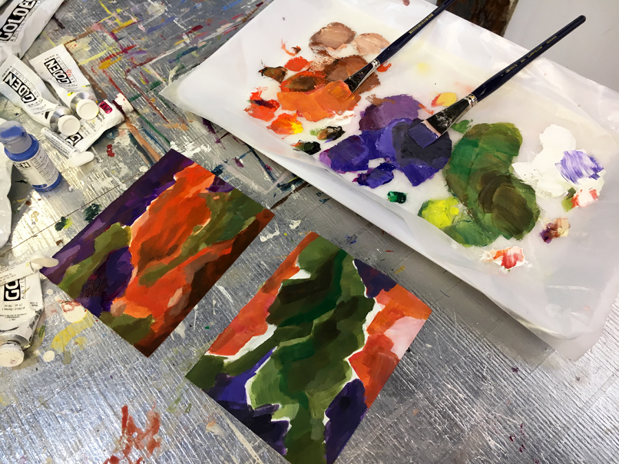 For several years I made hand painted greeting cards. I’d sit down and churn out more than 20 of them in a row. Just painting away, with no intentions, whatever. The result was often surprising. They looked really great and were often looser and more expressive than my actual work. All sorts of interesting imagery emerged. How could that be when I was barely even trying? I firmly believe the best way to approach making art is to “not give a crap”. That’s not to say that you don’t take it seriously, but rather you don’t worry about the outcome. In class by doing these fast small paintings that don’t matter, you’ll take the pressure off to make great works of art. You play around and see what happens. The result is often actual progress.