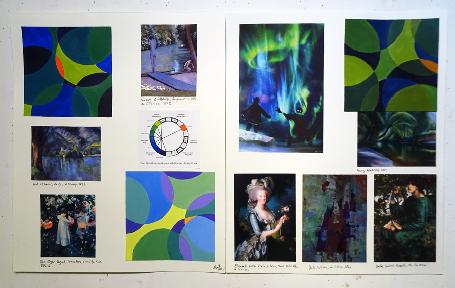 LESSON: At the start of class we walk around and talk about your work. We’ll look at any imagery you found and where it might fit into your book. Next I give a presentation where we’ll discuss the weekly colour relationships. We’ll look at real world examples of how historic and contemporary artists use these schemes in surprising and fascinating ways that are not at all obvious. Sometimes the schemes are very subtle. That’s the key. There’s so much more going on than you might realize. We’ll talk about the vibe and overall effect of these colour schemes. What kind of mood or feeling do they convey?
